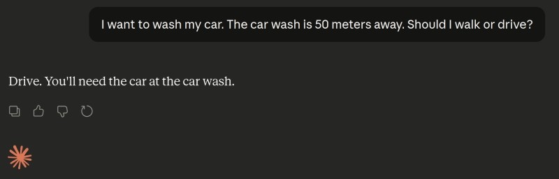 Comment on Ask AI: I want to wash my car. The car wash is 50 meters away. Should I walk or drive?