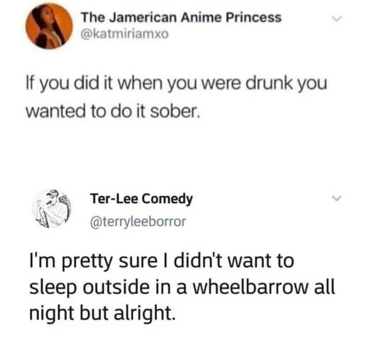 The alcohol just removes all filters. So yes, you wanted to sleep, but at normal times you’d be too embarassed to not sleep in your bed. With alcohol, it’s sleepy time, you sleep and that wheelbarrow looks a lot more inviting than the floor.