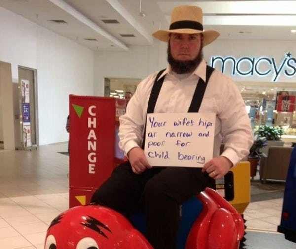 O yeah? Well your wife’s homemade pants are poor quality and her bonnet is crooked.