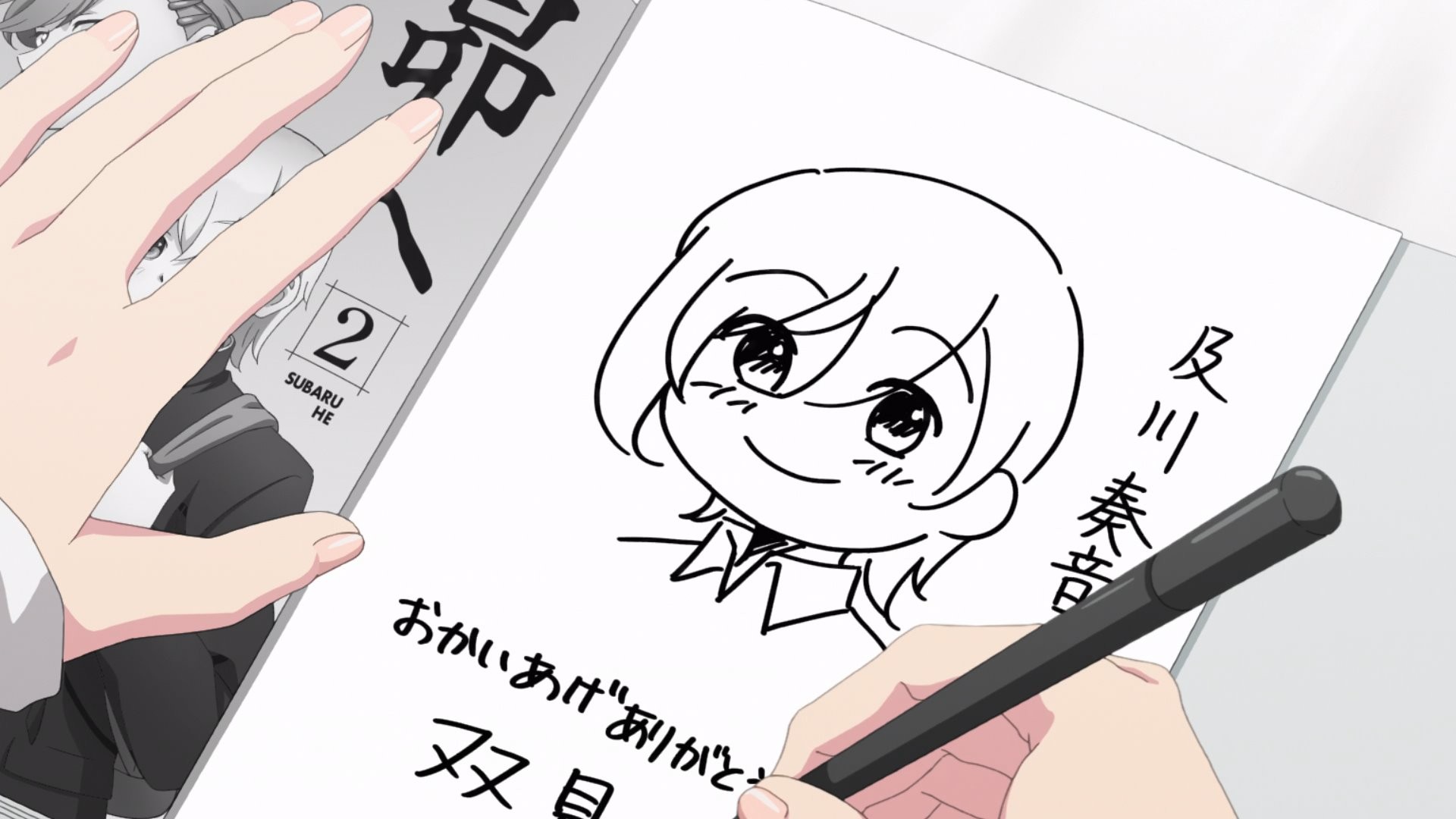 The person who came late to the signing was Oikawa Kanon, a character from The Moon on a Rainy Night, another of the author’s manga. Futami-sensei recognized she was hard of hearing and made big body gestures when talking to her.
