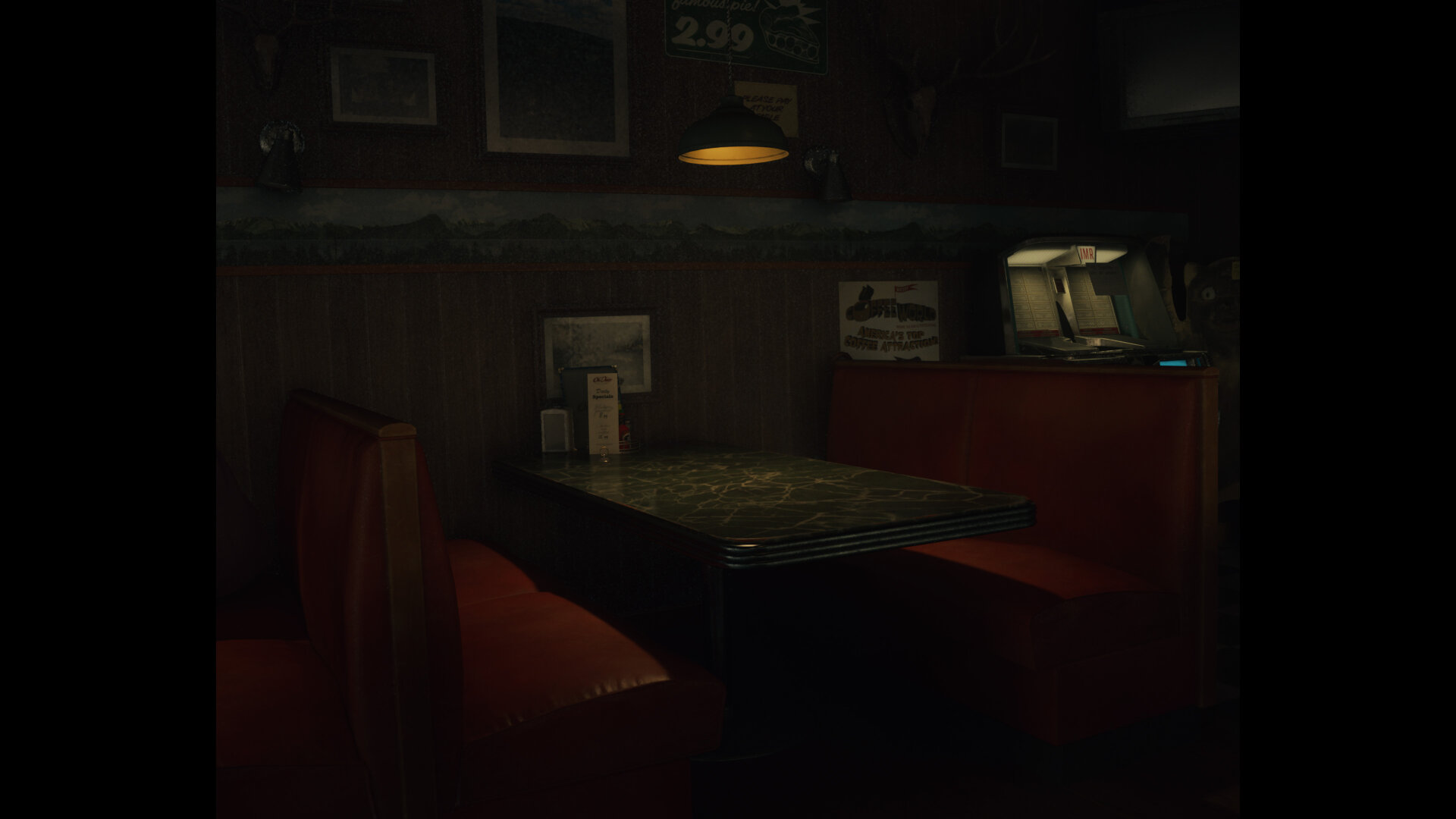 I tried to direct the viewer to the center of the table here in this one. I tried it by using the Lamp and making the orange a little brighter. I thought it acted as a sort of arrow pointing down to the table, which is the table where the Anderson Brothers sit in the first game.