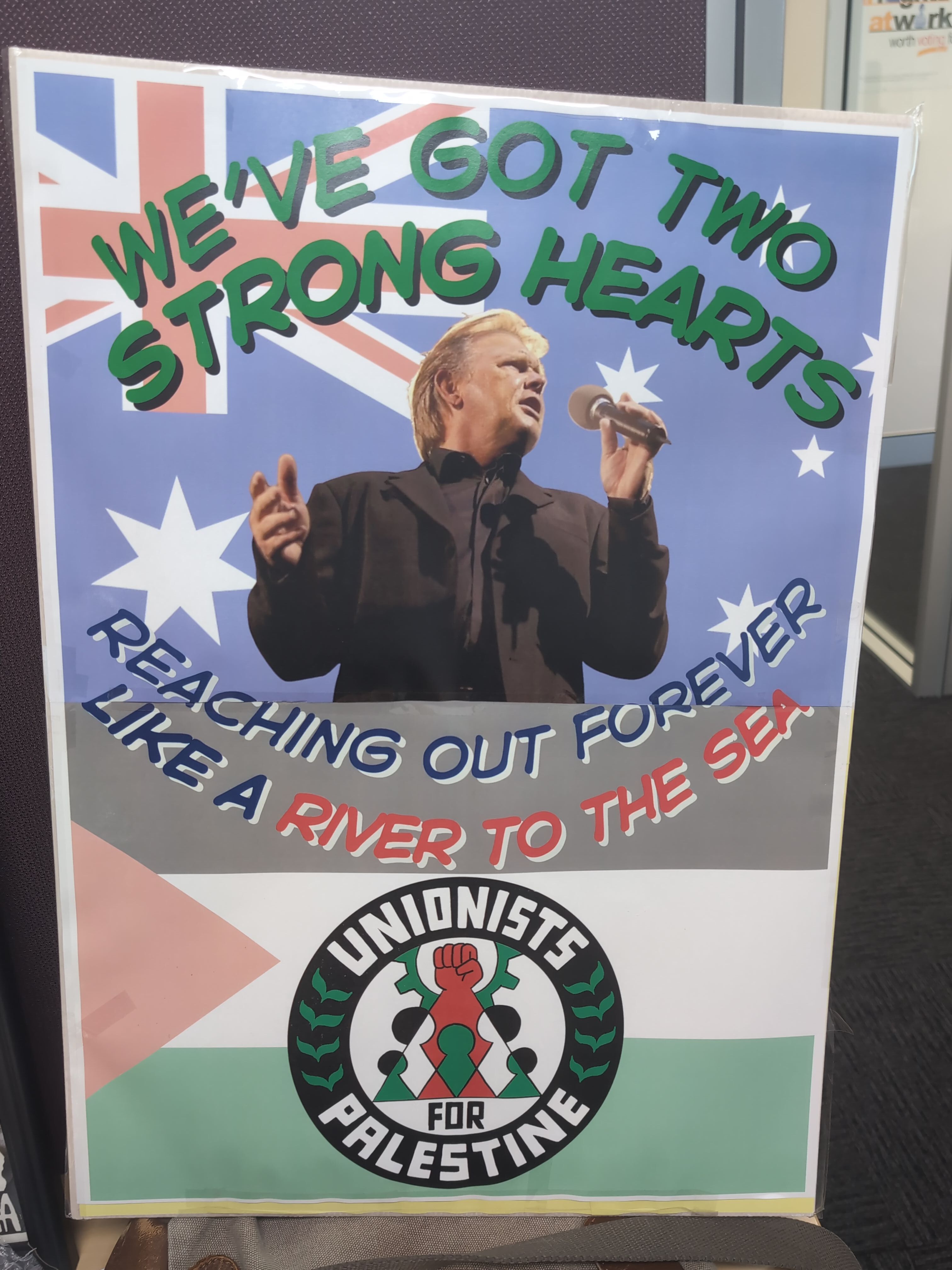 This is a John Farnham appreciation shirt! “TWO STRONG HEARTS. We stick together from the River to the Sea! Ruuuning free!” See. All good.