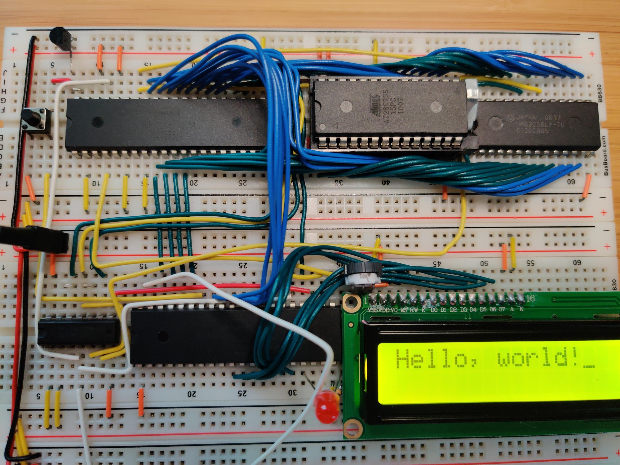 There’s just enough room on the left side for the DIP40 ICs. The DIP28s go on the right, with a few columns to spare. Since the data bus starts at column 21, it aligns nicely with the numeric labels on the breadboard. The 1st data line is at column 21, 2nd line is at 22, 3rd at 23, and so on. I put the reset and clock lines in between the data and address busses in order to maintain this pattern for the address lines: 1st at 31, up to 16th at 46. I guess I could have gotten 0-based indexing instead of 1-based if I had put the DIP40s on the right side, but the 6502 really wants to be on the left side due to its pin layout.