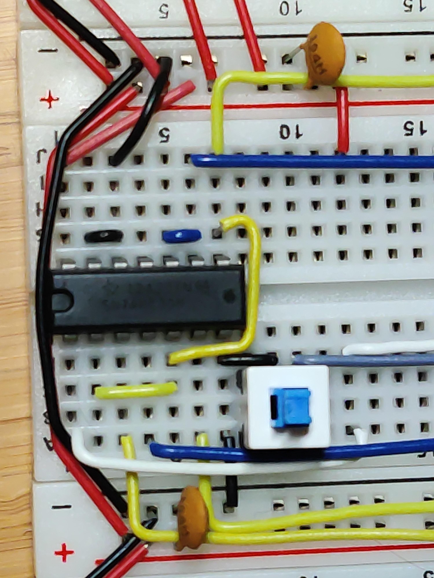 The center pins of the button share a column with the GND pin of the oscillator. The left pins are in the unusable space between the oscillator and the NAND IC. The right pins are in an otherwise unused column that runs underneath the oscillator. Since the reset button doesn’t take up any extra space, there’s room for an additional DIP14 next to the oscillator, and another two DIP14s or DIP16s to the right of the bus on that board.